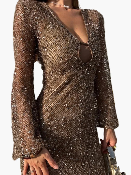 Robe de soirée femme élégante à sequins, col plongeant, manches longues, style glamour