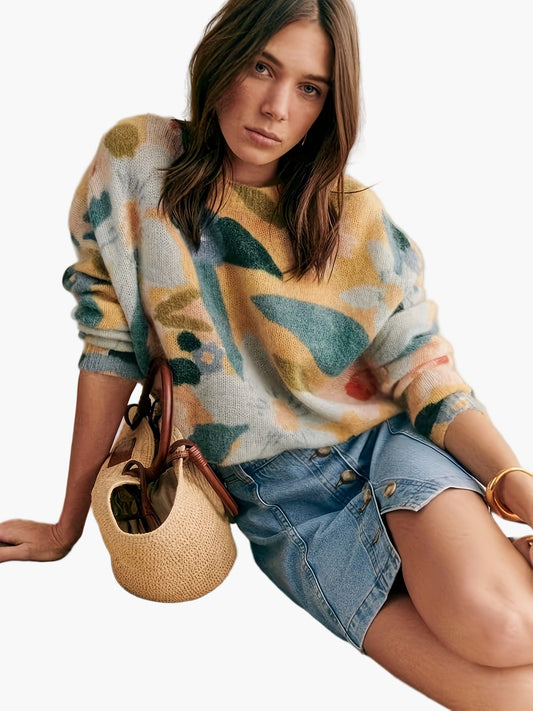 Pull femme élégant style artistique pour automne/hiver - motif floral abstrait, coupe moderne