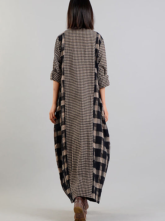 Abito lungo vintage a quadri per donna, stile ampio e informale, scollo a V, maniche lunghe, ideale per un aspetto bohémien elegante