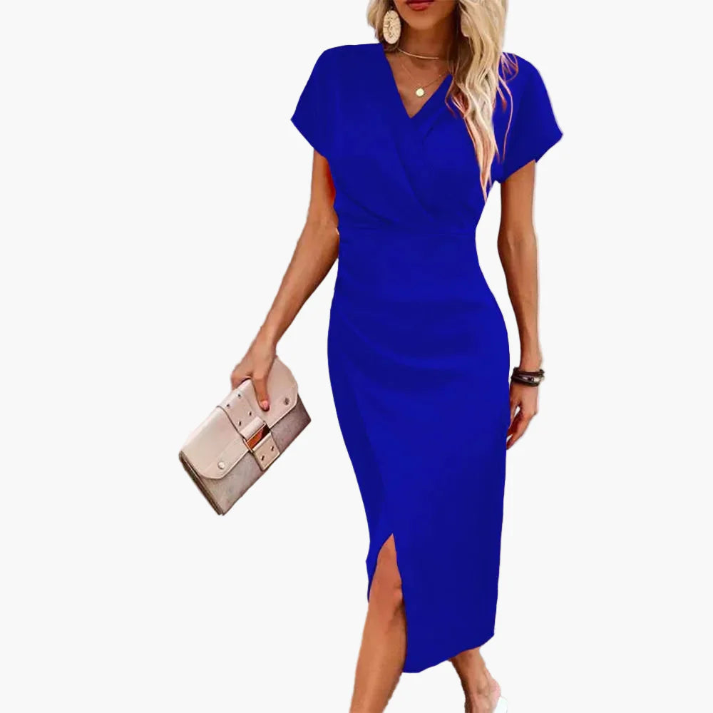 Mostra un aspetto sofisticato e femminile con questo elegante vestito midi a maniche corte da donna, progettato in uno stile incrociato lusinghiero. La sua linea aderente esalta la silhouette offrendo al contempo grande comfort, ideale per giornate in ufficio, appuntamenti o serate con amici. La scollatura a V valorizza il portamento, mentre lo spacco discreto all'orlo aggiunge un tocco di modernità e audacia.