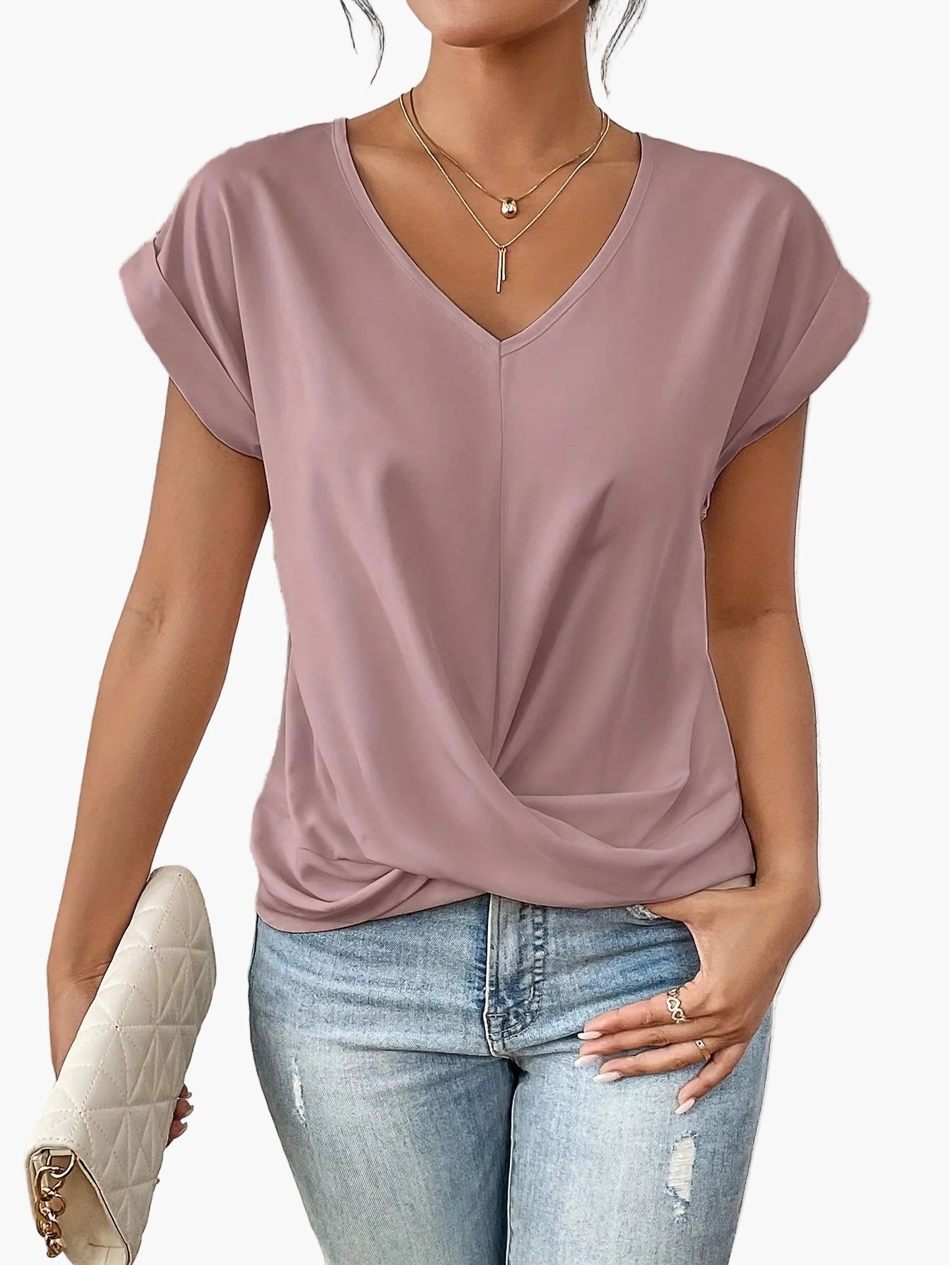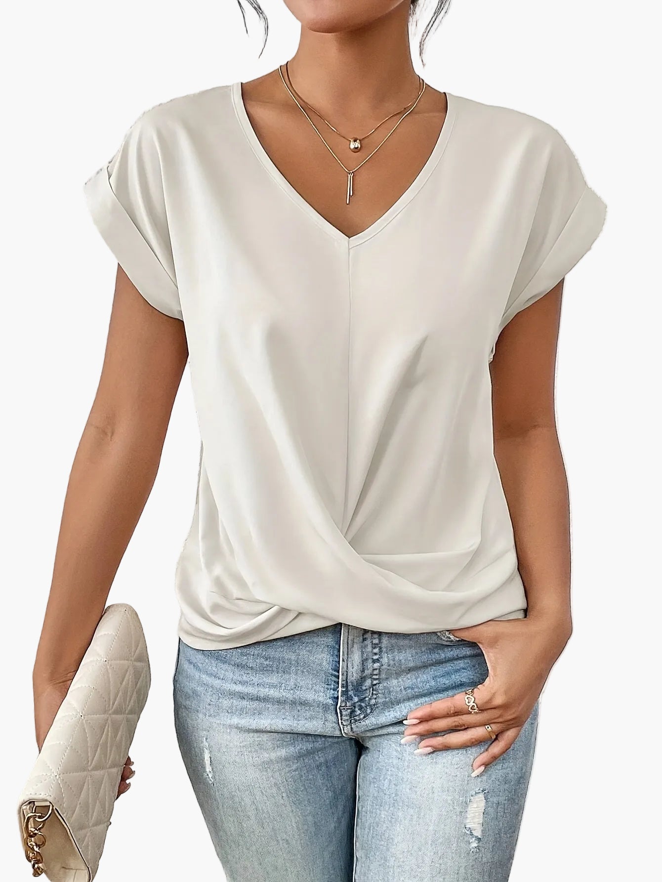 Aggiungi un tocco di dolcezza ed eleganza al tuo guardaroba con questa t-shirt casual da donna con scollo a V. La sua linea fluida, le maniche risvoltate e il drappeggio leggermente incrociato in vita offrono un look moderno che esalta tutte le silhouette. Perfetta per giornate rilassate, uscite con amici o anche per uno stile casual chic in ufficio.