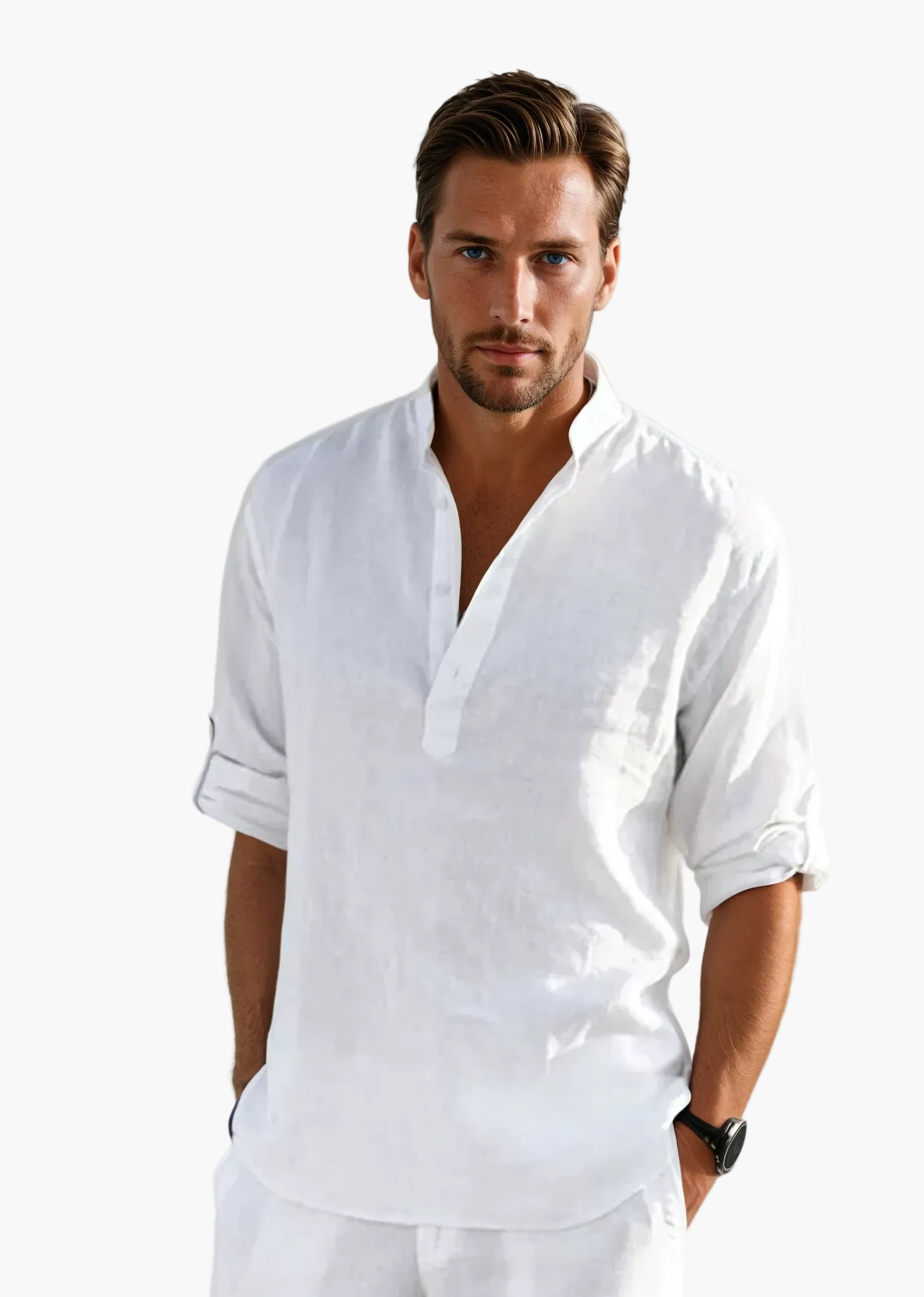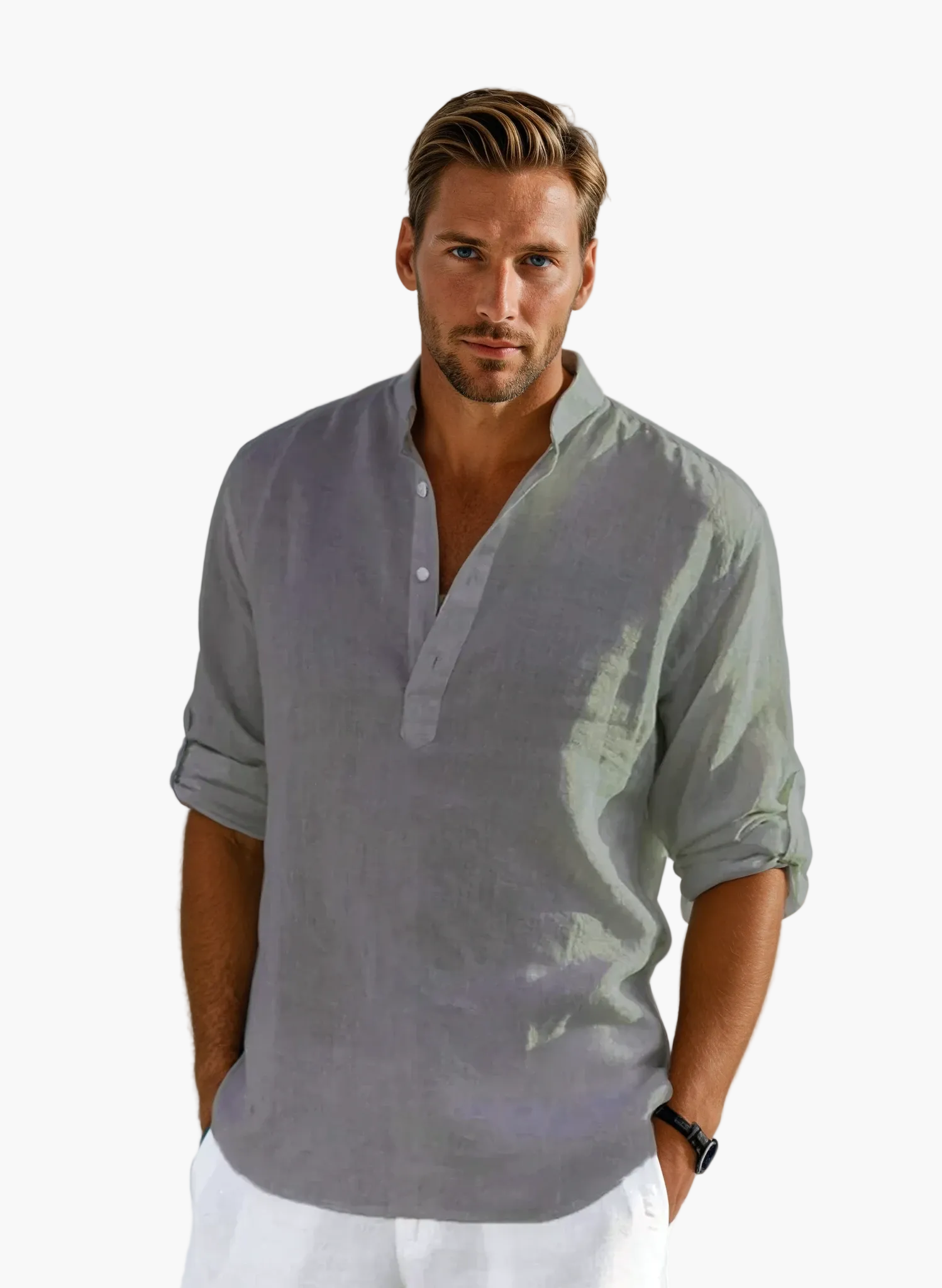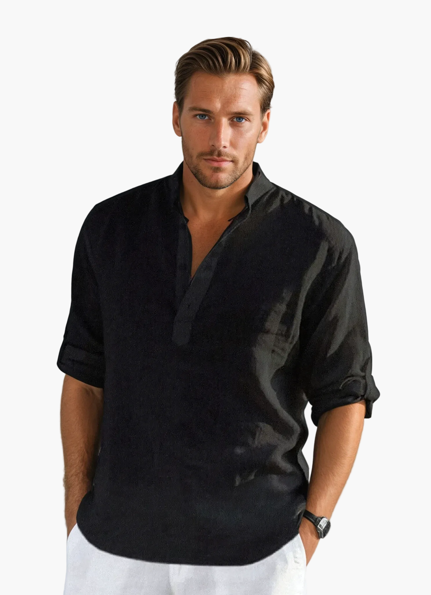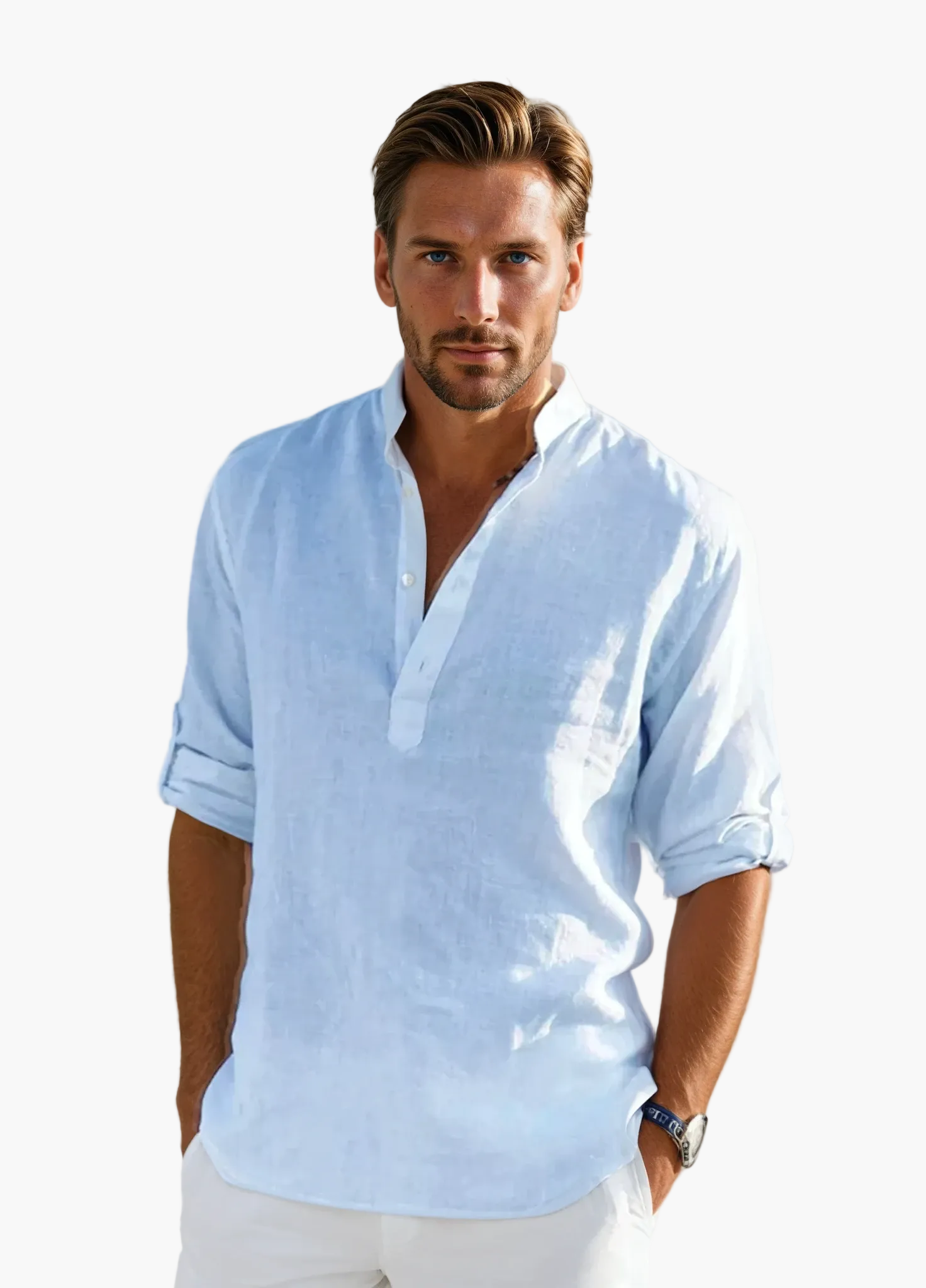 De Tunesische kraag en de oprolbare lange mouwen geven je outfit een moderne en chique touch. Makkelijk te combineren, dit overhemd past zowel bij een nette broek als bij een short, waardoor het de perfecte keuze is voor alle zomerse gelegenheden, of het nu een wandeling langs zee is of een diner op het terras.