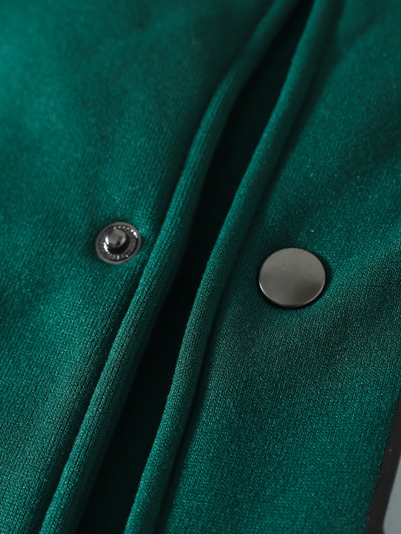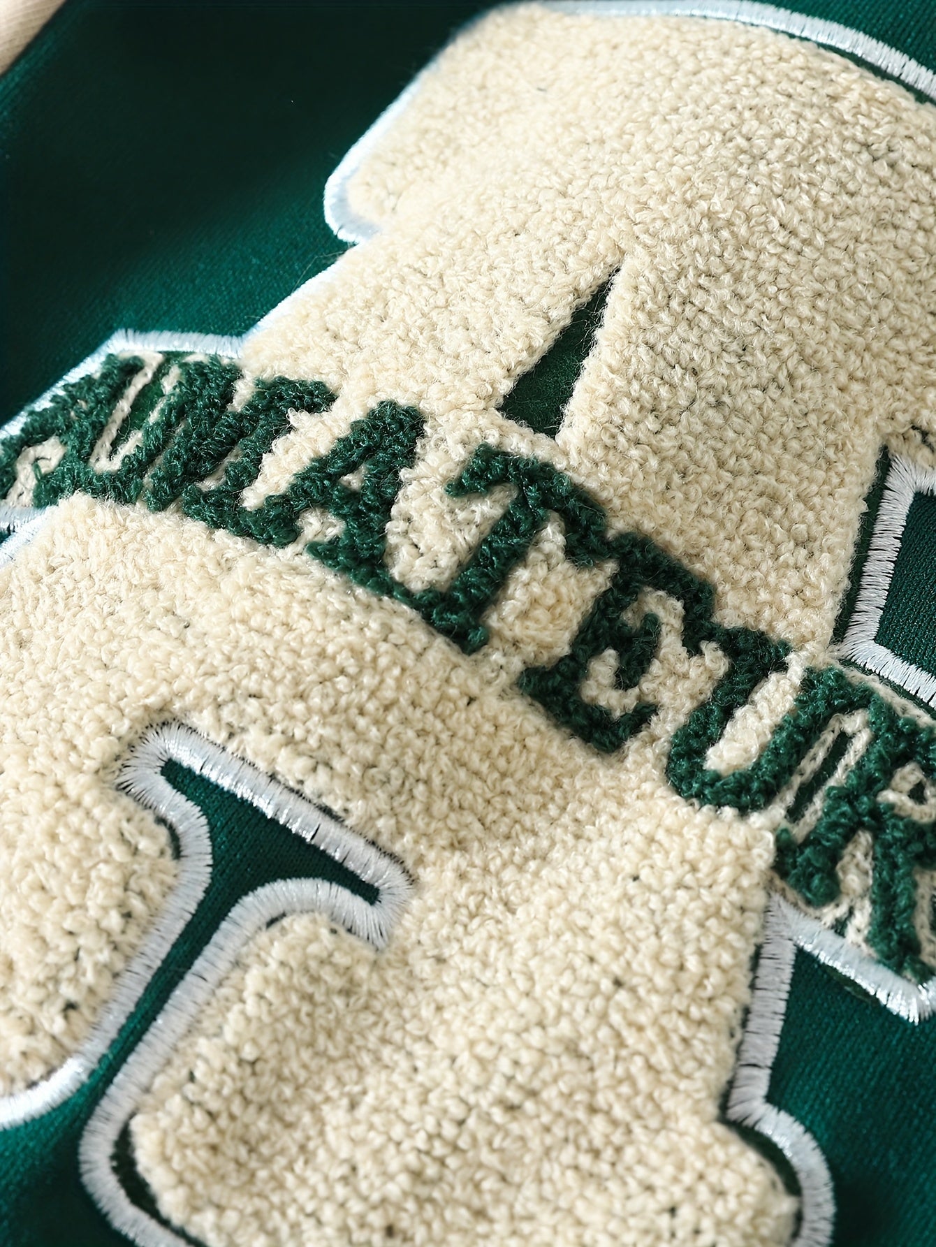 Laat een trendy en zelfverzekerde look zien met deze varsity set voor heren, bestaande uit een universiteitsjack en een bijpassende broek. Met een retro-chique stijl geïnspireerd op Amerikaanse campussen, valt deze set op door geborduurde details, patches en inspirerende teksten zoals « Slow down and discover more of the good things around you ».